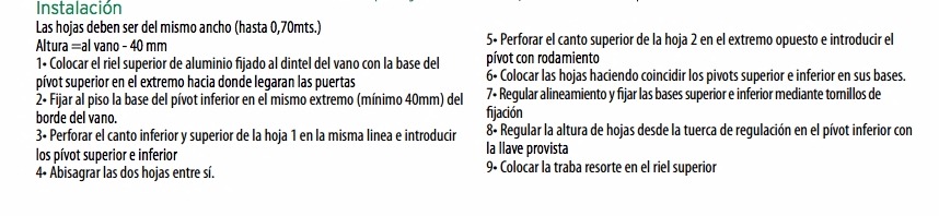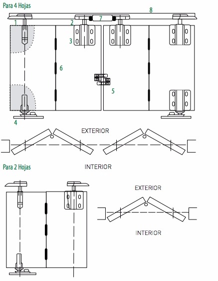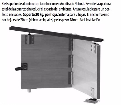 Carros de 4 ruedas, con cuerpo de poliamida con fibra de vidrio, para mayor resistencia. Permite la apertura total de las puertas sin reducir el espacio del ambiente. Sistema para 2 hojas plegables para un mismo lado. Soporta 60kg. por hoja.