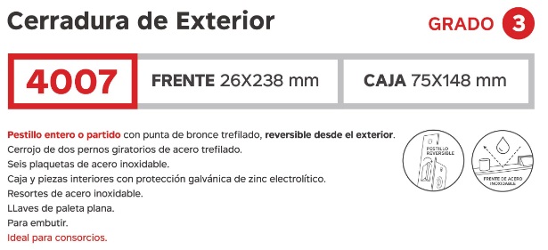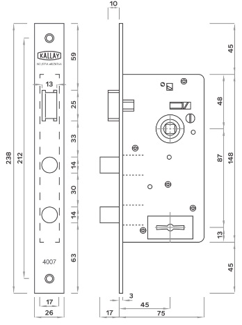 Frente ANCHO 26 x 238 mm Caja 75 x 148 mm Cerrojo de PERNOS Llave plana Pestillo reversible