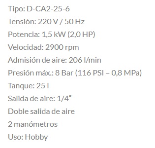 Tipo: D-CA2-25-6Tensión: 220 V / 50 HzPotencia: 1,5 kW (2,0 HP)Velocidad: 2900 rpmAdmisión de aire: 206 l/minPresión máx.: 8 Bar (116 PSI – 0,8 MPa)Tanque: 25 lSalida de aire: 1/4″Doble salida de aire2 manómetrosUso: Hobby