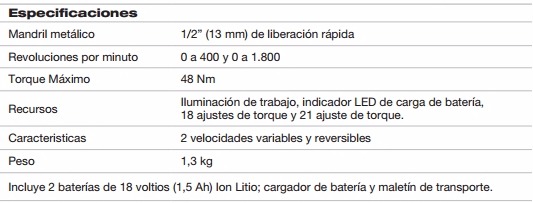 • Capacidades de taladro/atornillador: Taladrado en acero (mecha acero rápido) 13mm / Taladrado en madera (mecha tipo pala) 29mm / atornillado (diámetro) 6mm<