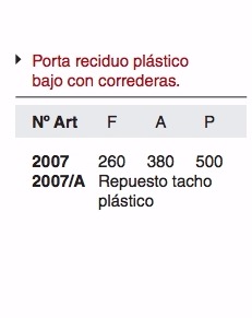 PORTARESIDUOS EXTRAIBLE:MARCA: FARK ( INDUSTRIA NACIONAL )MATERIAL: PLASTICO BLANCOTAPA AVATIBLE, CORREDERAS METALICAS, ANGULOS DE REFUERZO.REJILLA BLANCA EPOXI.