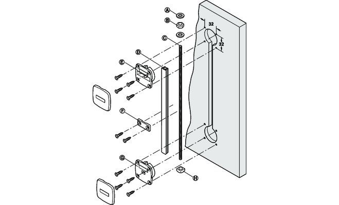 • Material: Barra roscada: acero, cazoleta: fundición de zinc, moldura de recubrimiento, tapas embellecedoras y placa de sujeción: plástico